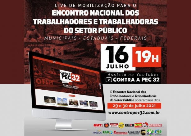 Com o objetivo de reforçar a organização da luta contra a ‘reforma’ administrativa do governo Bolsonaro (PEC 32/2020), as onze centrais sindicais do país e entidades que representam o funcionalismo realizam nos dias 29 e 30 de julho, de forma virtual, o Encontro Nacional dos Trabalhadores e Trabalhadoras do Setor Público.