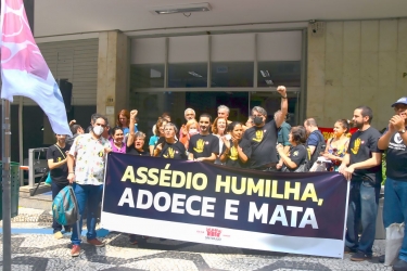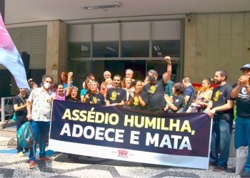 Ato em frente ao TRE, realizado em 20 de outubro de 2022; a atividade faz parte da Campanha Permanente contra o Assédio Moral e Sexual. Foto: Jesus Carlos