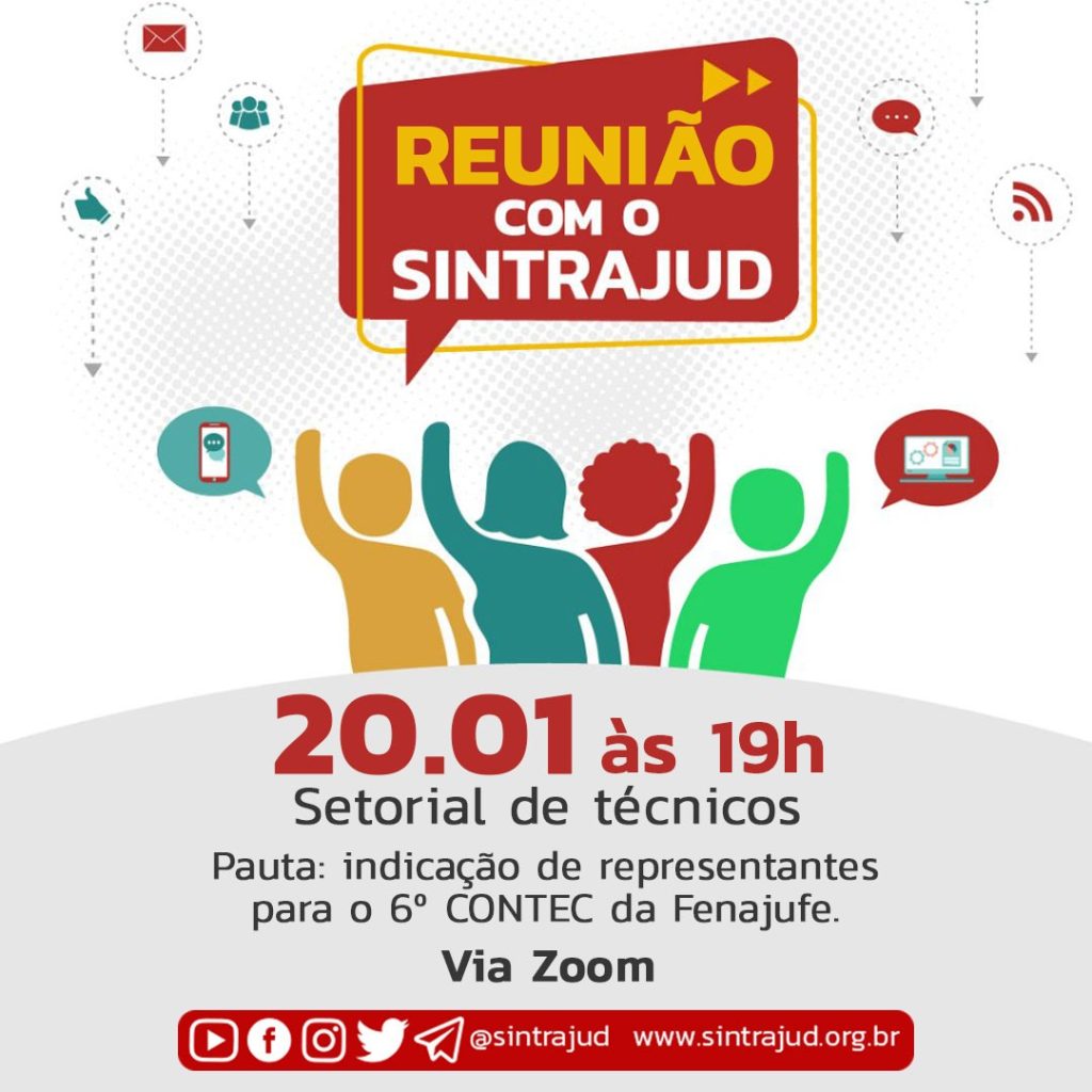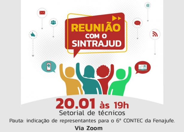 A diretoria do Sintrajud convoca todos as técnicas e técnicos do Judiciário Federal de São Paulo para reunião do segmento nesta quinta-feira, 20 de janeiro, às 19h, na plataforma Zoom. O objetivo é debater a pauta e a indicação dos colegas que irão participar do 6º Encontro do Coletivo Nacional da Fenajufe de Técnicos do Judiciário e do MPU, que acontece dia 29 de janeiro.