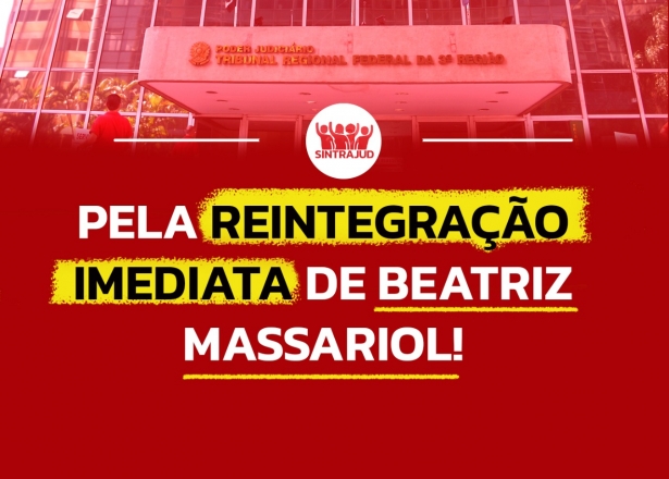 O Sintrajud defende a reintegração imediata da oficiala de justiça Beatriz Massariol e adotará todas as medidas cabíveis para a reversão da decisão da presidente do Tribunal. O pedido de reconsideração foi protocolado na noite desta segunda-feira, 18. Uma campanha pela reintegração de Beatriz já está sendo construída em conjunto com outros sindicatos e entidades de todo o país.