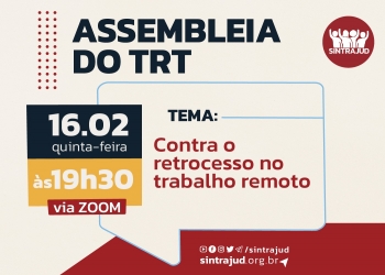 Na quinta-feira, 9 de fevereiro, após audiência do Sintrajud com a presidente do Tribunal, a desembargadora Beatriz de Lima Pereira, a categoria decidiu em assembleia virtual (foto) intensificar a pressão contra a nova regulamentação, contestando principalmente o limite estabelecido para todos os regimes de trabalho a distância, de 30% do total de servidores de cada unidade.