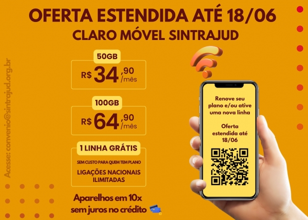 A pedidos, o Sintrajud estenderá o prazo de aquisição de aparelhos e planos de internet no convênio com a Claro até o próximo dia 18 (quarta-feira). Sindicalizados e sindicalizadas devem preencher aqui o formulário de adesão.Quem já tem plano de dados contratado com o Sindicato terá redução do valor com mais dados no pacote e a linha de voz ficará inteiramente gratuita, assim como novas linhas dados+voz.Valores dos planos:=> 50 Gb de dados, ligações ilimitadas em todo o território nacional: R$ 34,90=> 100 Gb de dados, ligações ilimitadas em todo o território nacional: R$ 64,90=> Somente voz, ligações ilimitadas em todo o território nacional: R$ 14,90Todos os planos garantem ligações ilimitadas para celular e fixo no Brasil, de qualquer lugar do país (exceto números 0300).Smartphones à venda parcelados em até 10 vezes no cartão de crédito:=> Samsung Galaxy A16 com 128 Gb de memória: R$ 900,00=> Samsung Galaxy S24 com 256 Gb de memória: R$ 3.260,00=> iPhone 15 com 256 Gb de memória: R$ 3.800,00=> iPhone 16 com 256 Gb de memória: R$ 5.100,00Acesse aqui o formulário de adesãoSe você é sindicalizado/a e ainda não usa o convênio Sintrajud/Claro, pode adquirir os novos planos com as mesmas condições dos/as usuários/as atuais. E se ainda não está filiado ao Sindicato, basta preencher a ficha de sindicalização clicando aqui.
